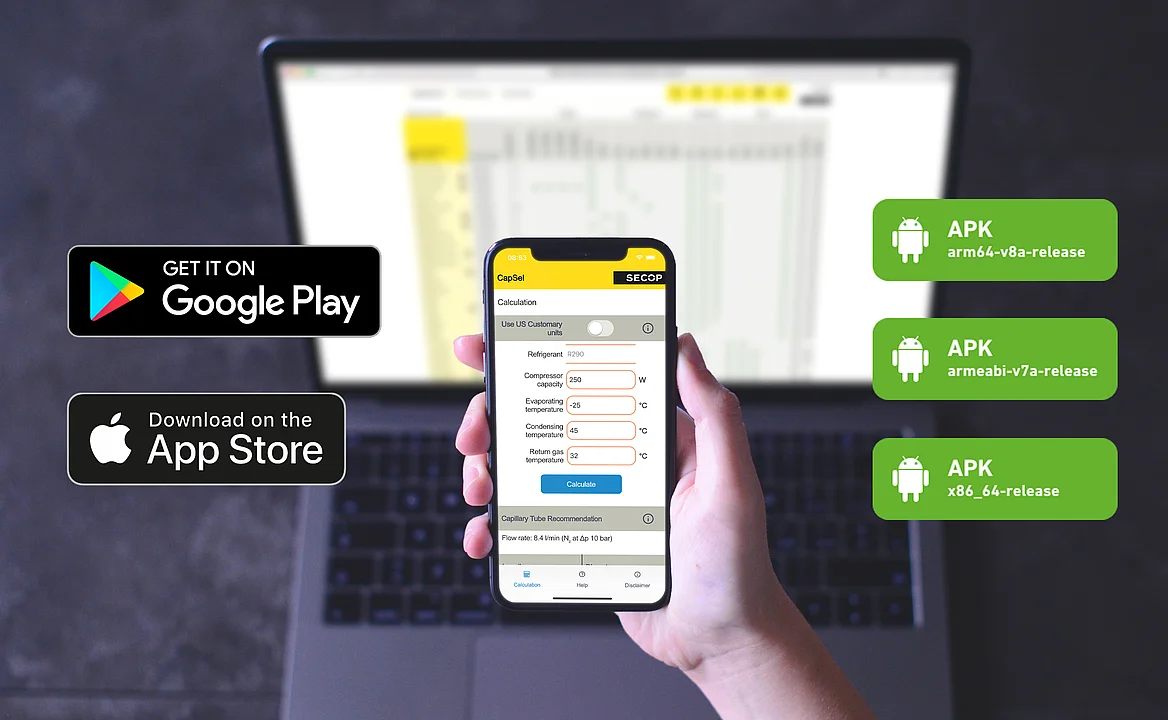 思科普毛细管选型应用程序Capsel可以在Apple iOS系统以及Google 安卓系统下运行,这是一款帮助用户根据经验公式计算制冷系统毛细管尺寸起始值的 App。