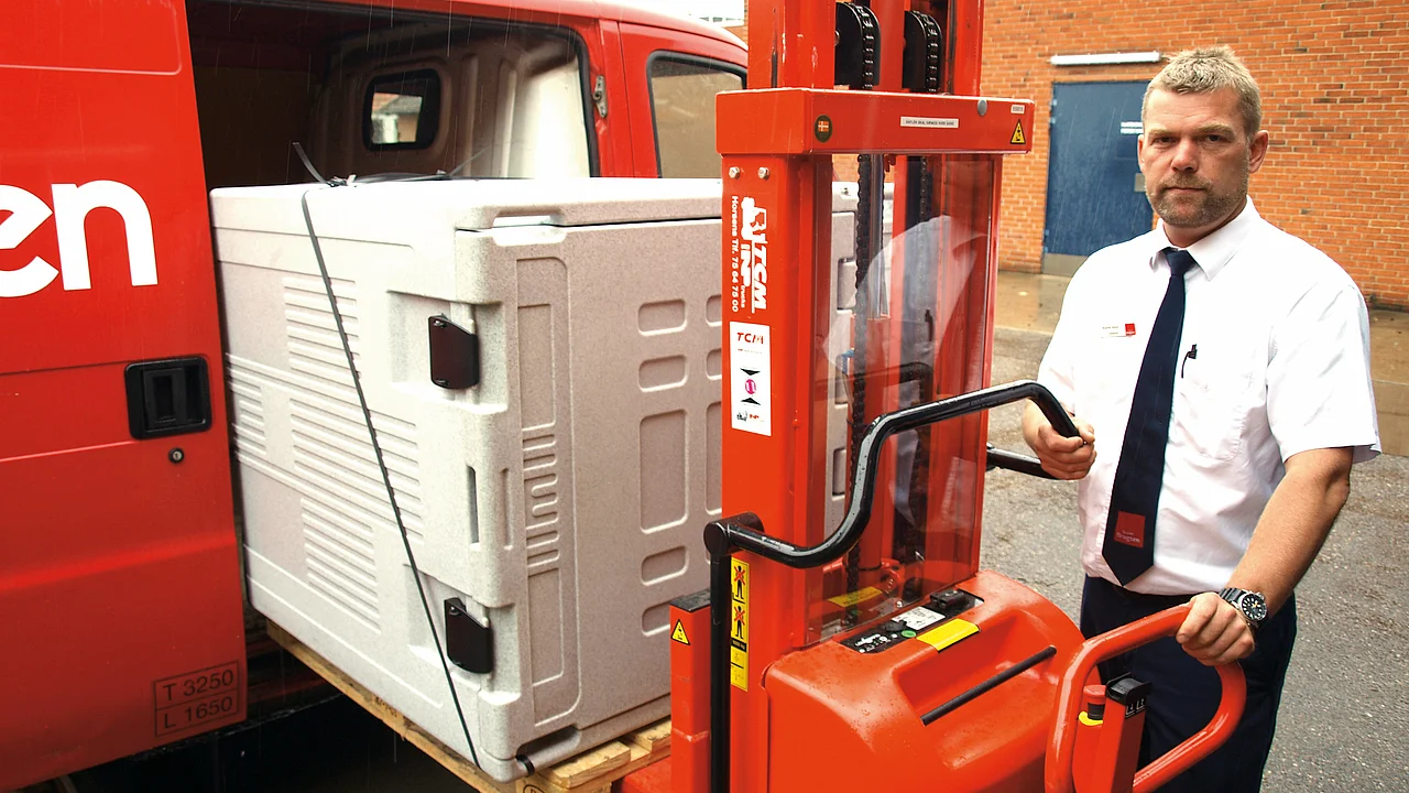 Durante la noche, la caja se coloca sobre el euro-palé en el almacén. A las 6 de la mañana, el temporizador enciende la alimentación eléctrica, asegurando que la temperatura esté exactamente a 1 °C cuando Bjarke llega al trabajo. Después, solo tiene que tomar el montacargas, colocar la caja dentro de la furgoneta y conectar la alimentación de 12 voltios.