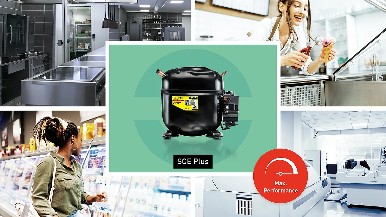 Ideali per applicazioni di ristorazione e vendita al dettaglio, come frigoriferi/congelatori di supermercati, congelatori walk-in, merchandiser a doppia porta in vetro, monoblocchi, sistemi sigillati, macchine per il ghiaccio ed altro ancora, i compressori SCE Plus offrono prestazioni eccezionali in varie condizioni operative: